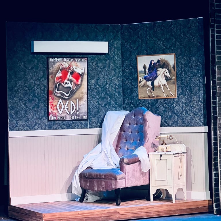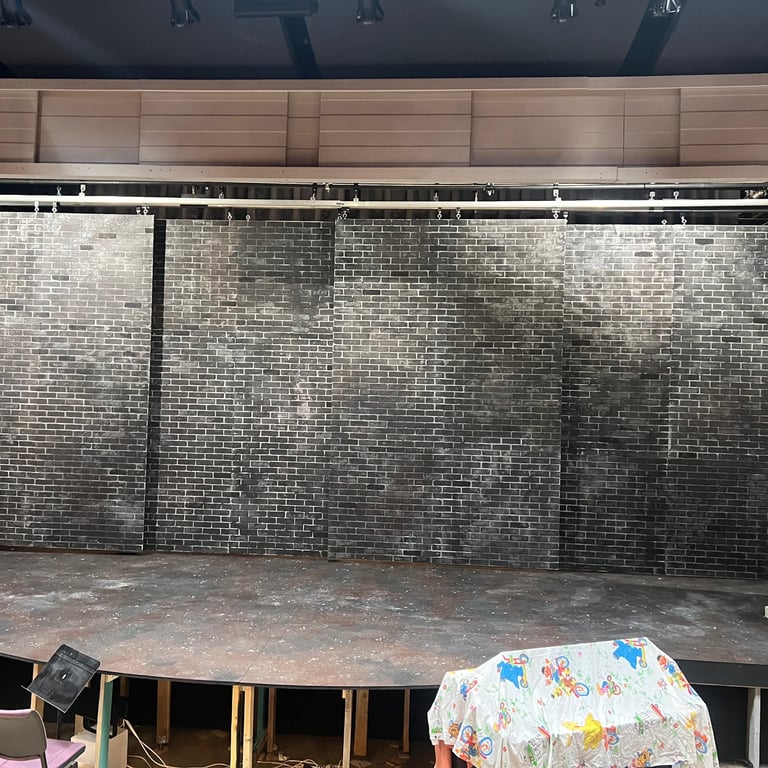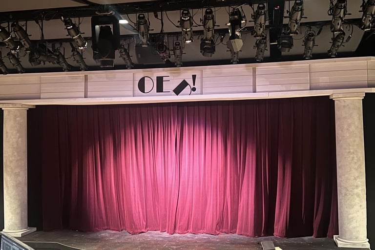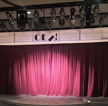 another challenge on this production was the marquee letters that needed to have a planned failure. we revealed the tittle of the show within as "OED" and the D at the end of the last musical number falls crooked as a column falls over. we achieved this with a solenoid and a magnet on the letter D that dropped it askew. also we made a pair of automated barn doors to open and close to reveal the tittle.